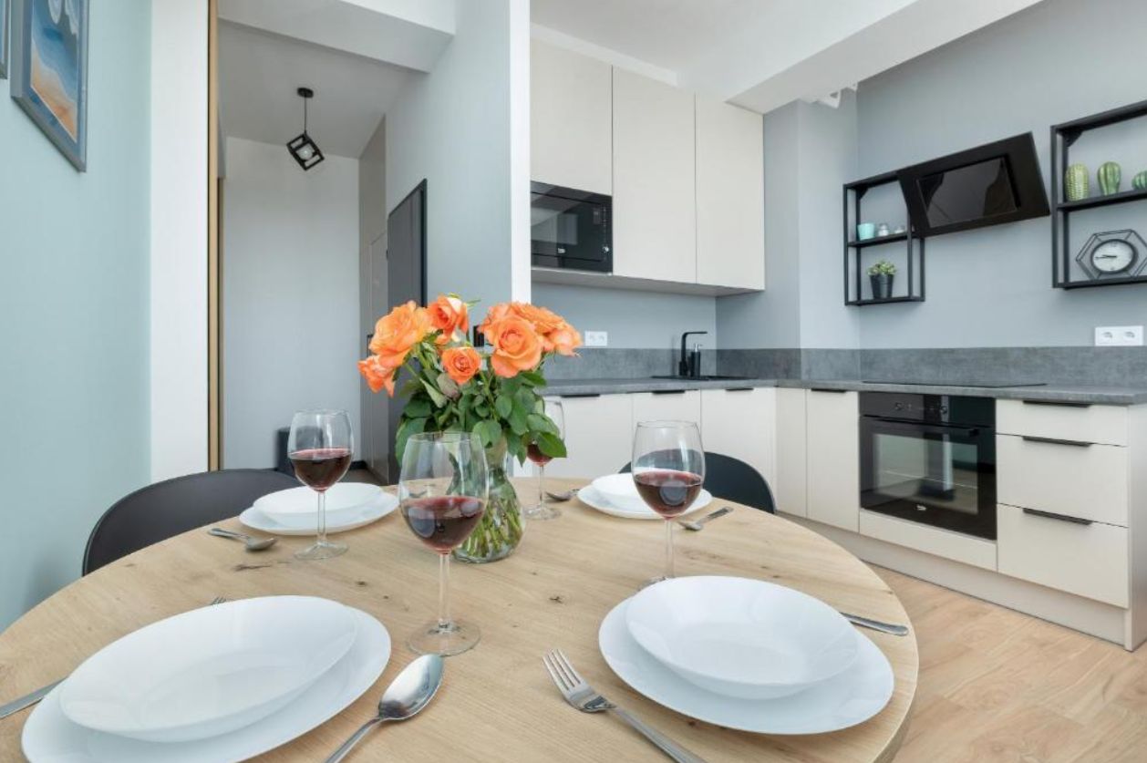 Całkowicie wyposażony aneks kuchenny (piekarnik, mikrofalówka, płyta indukcyjna, ekspres do kawy, czajnik elektryczny, toster, zmywarka) oraz łazienka (pralka, suszarka do włosów, sprzęt do prasowania).